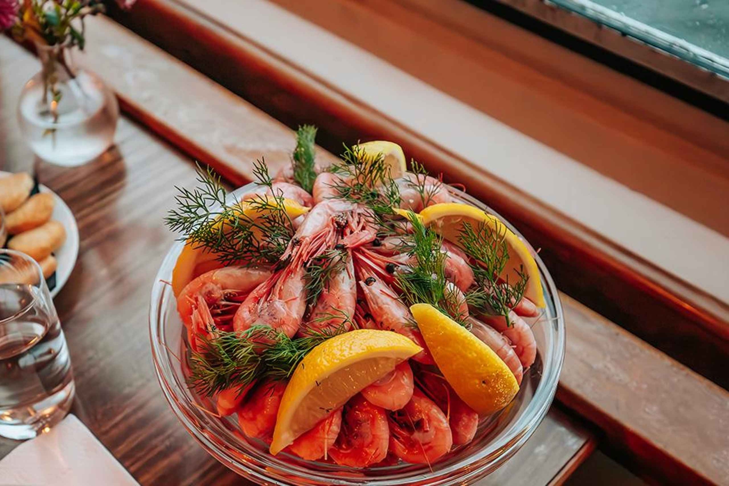 Goditi le ciotole di gamberi certificati ecologicamente accompagnati da pane, salse saporite, formaggio Västerbotten e burro cremoso. Mangia quanto vuoi. Acquista bevande rinfrescanti e altre bevande dal bar di bordo.